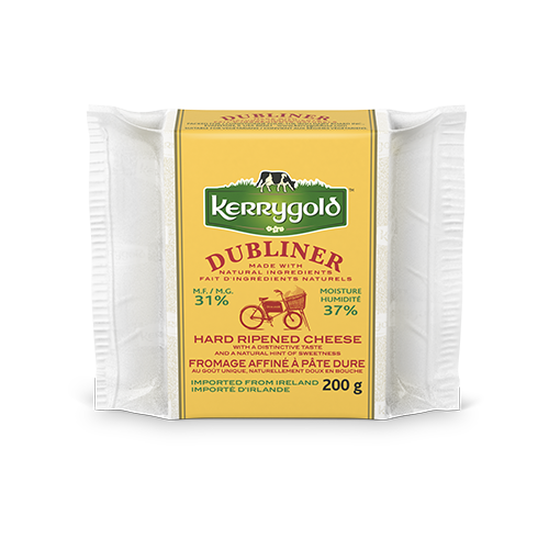 Dubliner® is a robust aged cow’s milk cheese with a bit of a hard texture similar to a Cheddar. In one bite you can taste the diversity of flavors – from nutty to sharp to sweet – that can only come from a natural cheese made from the milk of grass-fed cows. What might seem ambiguous is actually a well-balanced mix of cheese cultures and naturally occurring amino acids. This diversity pays off in its ability to be served alongside a full-bodied wine like Cabernet, a freshly pulled pint of Guinness, or simply melted between a few slices of crusty brown bread. Dubliner® Cheese is even available in a Reduced Fat version.